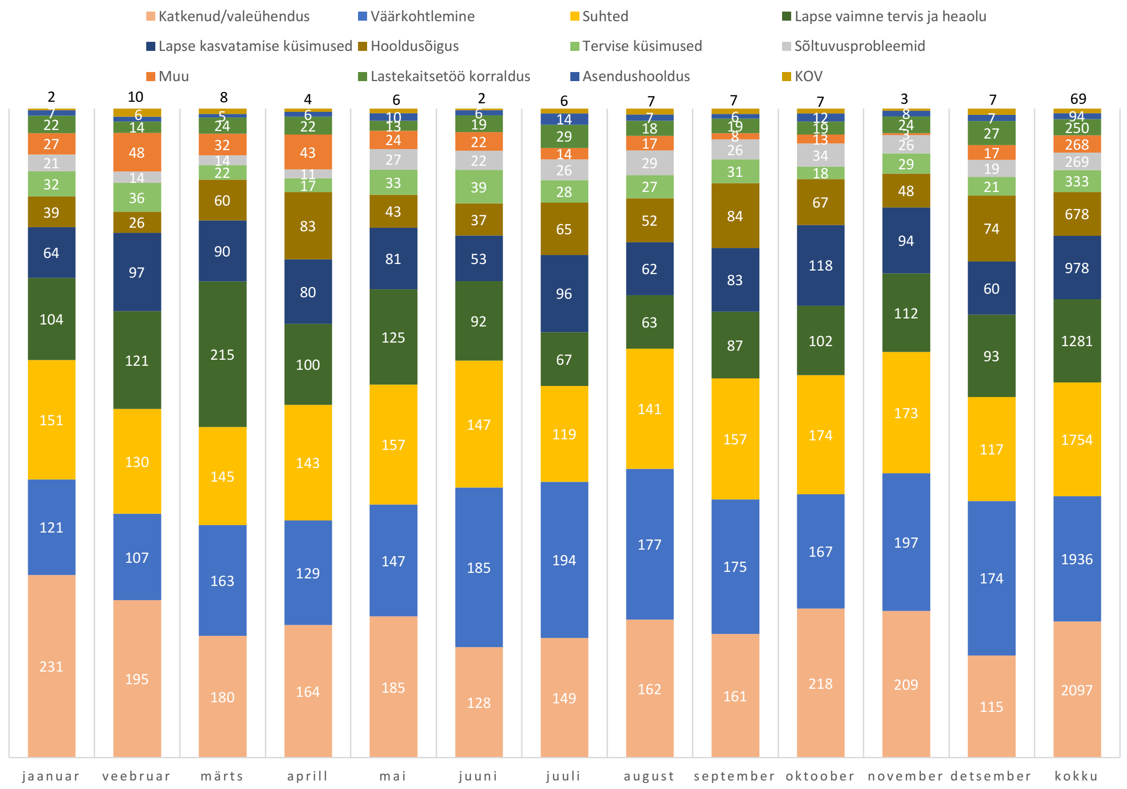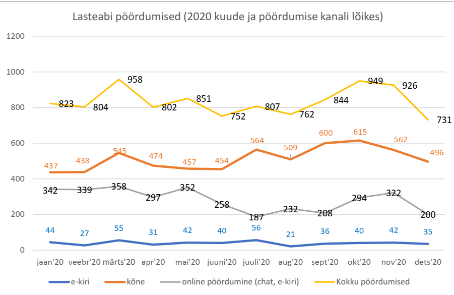 Kuigi inimeste keel on toredam kui numbrite keel, kõnelevad arvud inimeste eest ja annavad meile toimunust kiire ülevaate. Koroonaaja alguses (märtsis 2020) tegi meie pöördumiste arv järsu hüppe ja liikus tõusvas joones kuni 2020. a lõpuni. Päike ja suvekuud koos on parim vaimse tervise vitamiin ning annab inimestele suurema emotsionaalse heaolutunde, mistõttu oli rahulolu oma vaimse olukorraga suurem ja numbrid näitasid langustrendi. Kurvastuseks peab aga nentima, et suviti on vägivaldset käitumist rohkem – nii emotsionaalset-, füüsilist- kui ka seksuaalset vägivalda. Lasteabitelefonile helistatakse kõige enam suhteteemadel – nii laste omavahelised suhted, kui ka suhted vanemate või teiste täiskasvanutega. Head suhted on võti, mis avab ka neid uksi, mille ees on mitu lukku. Tuleb leida see turvaline inimene, kelle käes on õige võti. Lasteabitelefonil püüamegi olla need turvalised võtmekimbuga inimesed, kes kuulavad, toetavad, mõistavad ja aitavad.