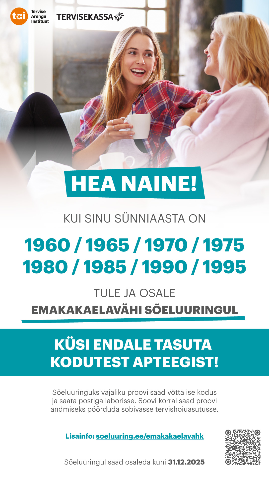 Sel aastal oodatakse emakakaelavähi sõeluuringule ravikindlustatud ja ravikindlustamata naisi, kes on sündinud aastatel 1960, 1965, 1970, 1975, 1980, 1985, 1990 ja 1995.