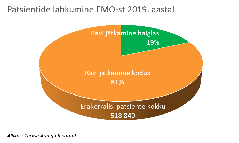2019. aastal osutas erakorralist meditsiiniabi 19 haiglat, kuhu pöördus aasta jooksul kokku 518 840 inimest ehk keskmiselt 1422 inimest ööpäevas. Erakorraliste patsientide arv on võrreldes 2018. aastaga jäänud samale tasemele. Erakorraliste patsientide arv on suurenenud piirkondlikes haiglates 1,4 protsenti ja vähenenud kesk- ning üld- ja kohalikes haiglates vastavalt 1,7 ja 1 protsenti. Enamik EMO patsientidest saadetakse pärast esmaabi osutamist koju. Vaid viiendik patsientidest vajab edasist haiglaravi (vt joonis).