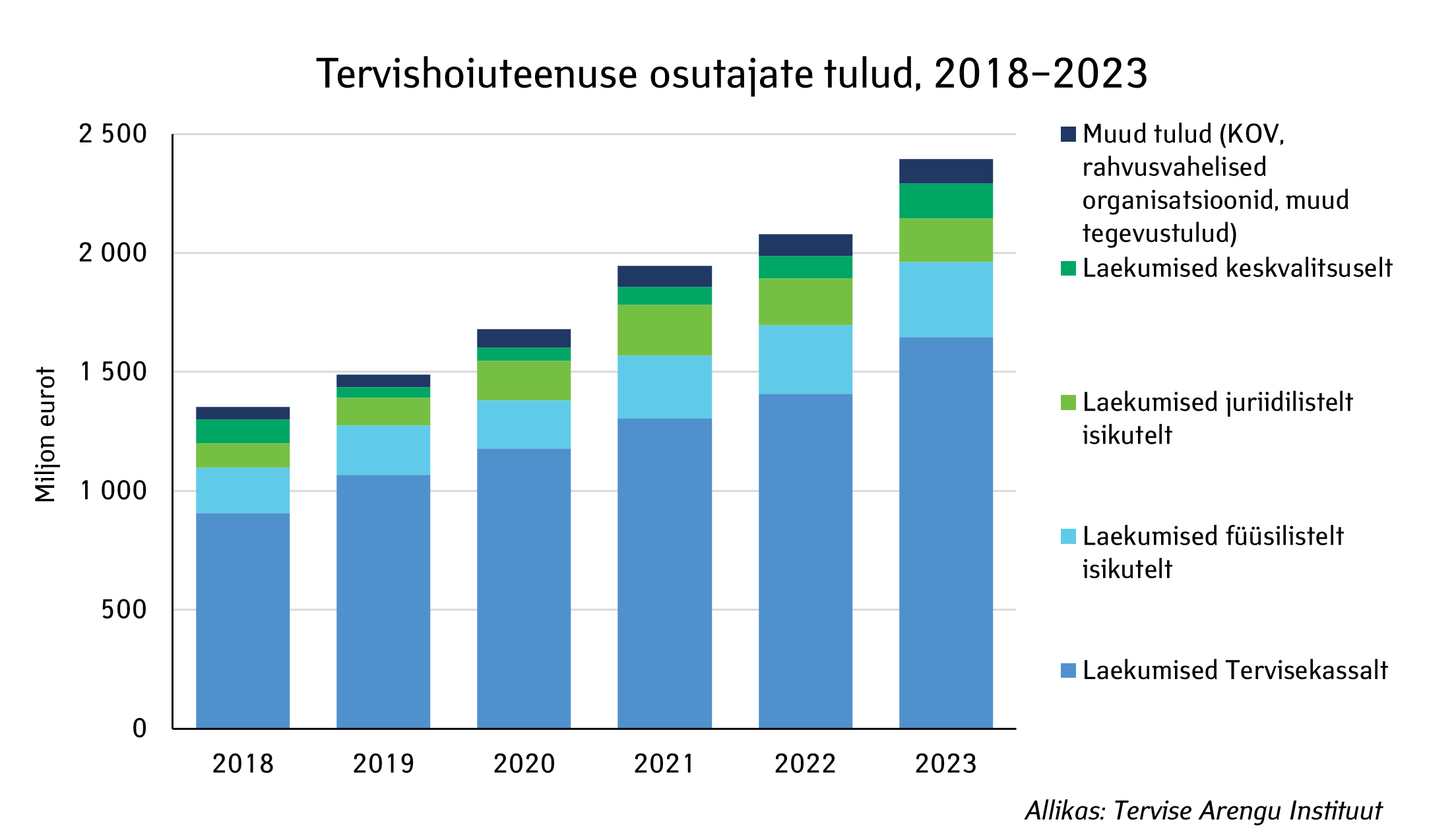 Tervishoiuteenuse osutajate tulud ulatusid 2023.aastal ligi 2,4 miljardi euroni ja olid üle 314 miljoni euro võrra ehk 15% suuremad kui aasta varem. Tulud kasvasid peamiselt tänu Tervisekassa rahastuse suurenemisele. Suurimateks tervishoiuteenuseosutajateks on haiglad. Nende osatähtsus tervishoiu tuludes oli ligi kaks kolmandikku (62,7%). Haiglate tulud ületasid 1,5 miljardit eurot, millest 79% laekus Tervisekassalt. Haiglate tulud kasvasid 19% eelmise aastaga võrreldes seoses osutatavate teenuste hinnatõusuga ja ka tänu põhivara investeeringute sihtfinantseerimisele. Nii perearstiabi- kui hambaraviteenuse osutajate tulud moodustasid 11% tervishoiu tuludest. Kui perearstiabis laekub 95% tuludest Tervisekassalt, siis hambaravis maksavad teenuste eest suures osas patsiendid ise. Ambulatoorse eriarstiabiteenuse osutajate osatähtsus tervishoiu tuludes oli 9%, teiste teenuseosutajate (kiirabi, taastusravi, diagnostika, õendusabi) osatähtsus kokku jäi alla 7%.