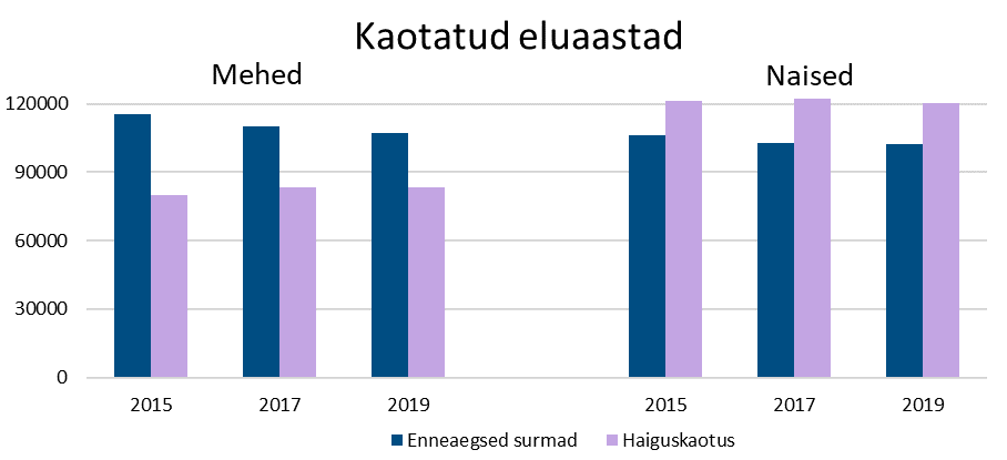2019. aastal kaotas Eesti rahvastik 413 226 eluaastat, mis on ligi tuhande aasta võrra vähem kui 2015. a. Mehed kaotasid enneaegsete surmade ning haigestumise tõttu 190 619 ja naised 222 604 aastat.
